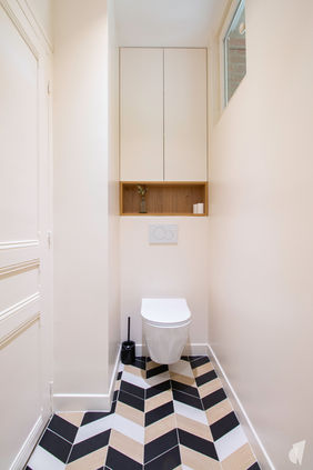Principalement destinée à l'usage des enfants de cette famille, cette pièce d'eau se devait ultra fonctionnelle et pleine de vie. "Du rangement" a été le mot d'ordre du cahier des charges pour cette pièce étroite dont l'aménagement a été complètement repensé pour optimiser l'espace et faciliter la circulation en évitant les bousculades du matin. Un WC a également été ajouté, grâce à l'agrandissement de la pièce sur le pallier.